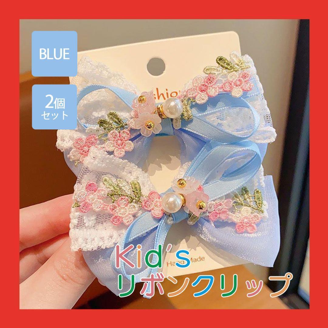 - ヘアアクセサリー ブルー 水色 リボン 2個セット 花 キッズ ヘアピン 髪飾り 七五三 発表会 結婚式 フォーマル
