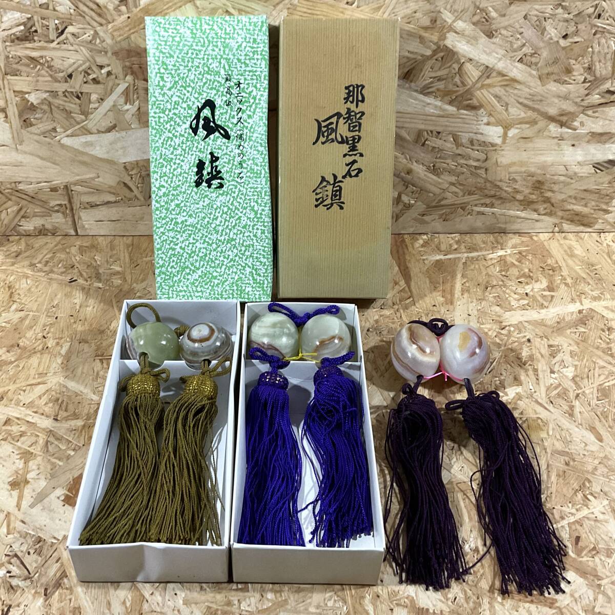 - 天然石 風鎮 3組セット オニックス 那智黒石鎮 箱付き 掛軸 書道具