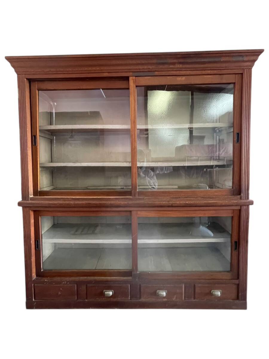> JS383 時代家具 大正時代 ゆらゆらガラス アンティーク 木製棚 食器棚 ガラス戸棚 高さ167cm 横159.5cm 奥行き43.5cm 取手一つ欠損
