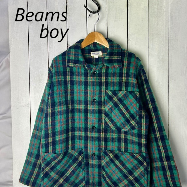 > BEAMS BOY チェック CPOウールシャツジャケット ウールカバーオール 緑系 ビームスボーイ M~L程度 CPOシャツ 秋冬 厚手 オールド ●181