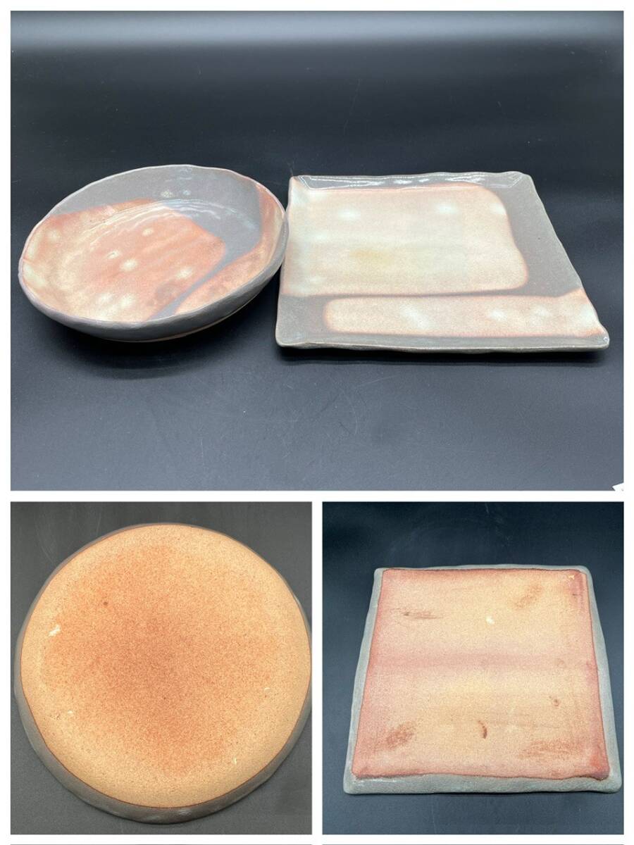 > 松野龍司 作 萩焼 皿 2点 在銘 丸皿 直径22×高3.5㎝ 角皿 23.2×24×1.8㎝ 和食器 茶道具 煎茶道具 菓子器 菓子鉢 陶器製皿 (20363)