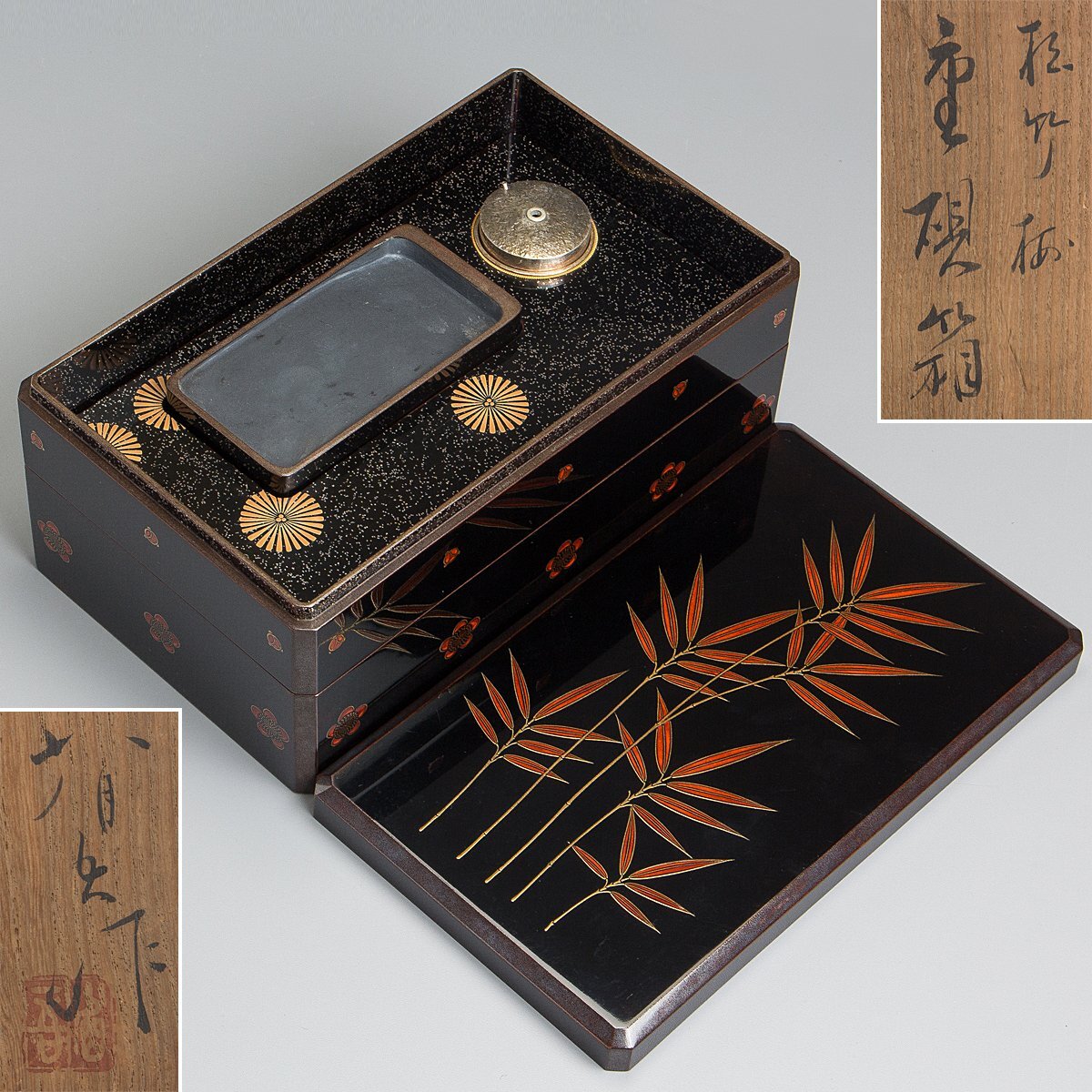 “商品説明の『続きを見る』もしくは携帯端末アプリの『もっと見る』から追加画像をご覧ください” 商品説明 品名 木製漆塗 松竹梅重硯箱 在銘 共箱 寸法 縦22.8cm 横13.5cm 高10.5cm ※寸法に若干の誤差が生じます。ご承知下さい。 状態 良好。 略歴 備考 補足 送料 ■ゆうパック80サイズ(詳細は以下の〈配送方法〉を参照して下さい) ※形状・性質が異なるものは同梱をお断りさせていただく場合がございます。同梱の場合、サイズ変更により表示される送料の金額を修正させていただく場合がございます。予めご了承いただきますようお願い致します。 ※2023年10月より日本郵便の郵便価格改定により、配送料を改訂させていただきます。何卒ご理解の程よろしくお願い致します。