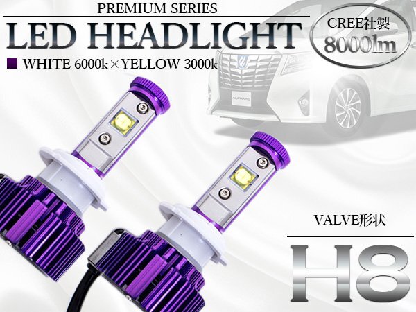 - 12V 24V LEDヘッドライト H8 ホワイト イエロー 切替可能 8000lm 3000k 6500k 白 黄色 ガラス管 一体型 オールインワン