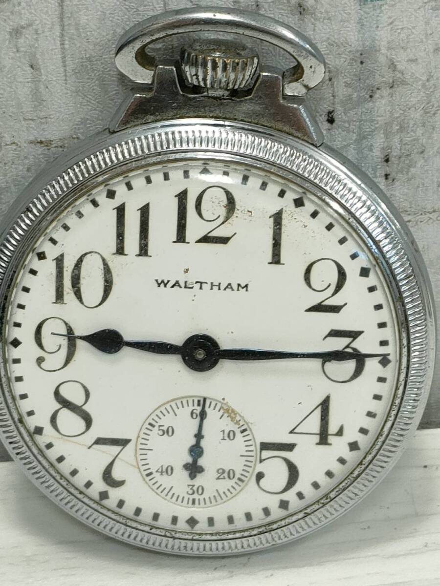 - WALTHAM MASS ウォルサム 懐中時計 手巻き 機械式 白文字盤 ポケットウォッチ リューズ不良 ジャンク 現状品 【26067