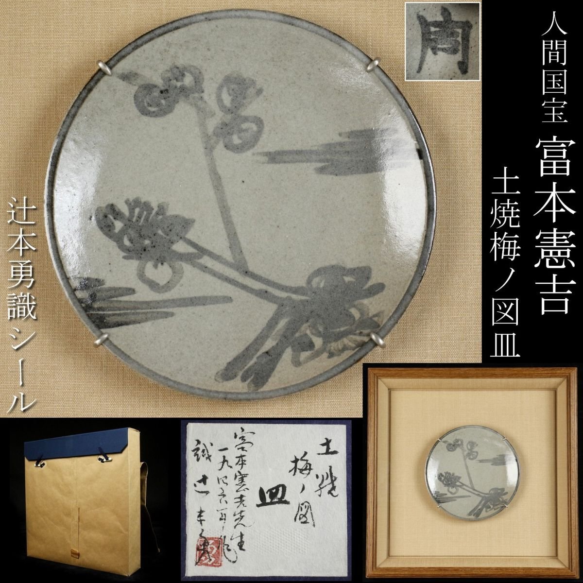 > 【LIG】本物保証 人間国宝 富本憲吉 土焼 梅ノ図皿 飾皿 1946年 辻本勇識シール 額装 タトウ箱 [.TT]25.3