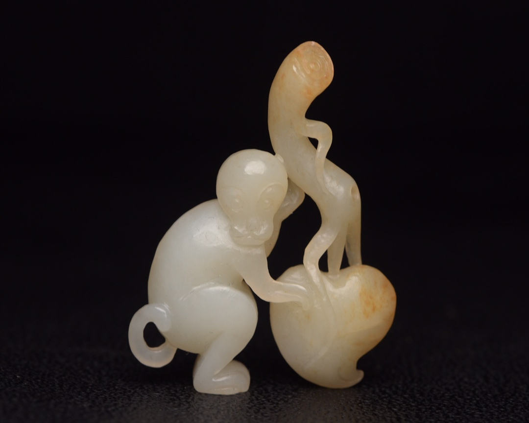 - 旧蔵 和田玉彫 靈猴獻寿 根付 中国古玩 骨董品 時代物 稀少唐物
