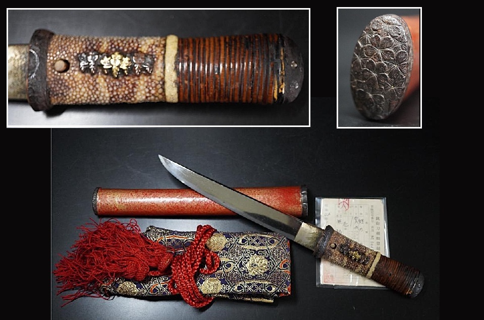 ![D5821 武具 短刀 無名 [朱塗 鞘][藤巻鮫皮巻 柄][五三桐図 両目貫][鉄地銀象嵌 桜花尽 頭/喰出鍔/鯉口/小尻] 外装拵え 登録証付 刀装具拍卖](http://yahooimg2.ymibuy.cn/i/auctions.c.yimg.jp/images.auctions.yahoo.co.jp/image/dr000/auc0111/user/0e74a95f6241bd3b209560a50761ee0bb7e2a232a975f9d2e056e7438aed74b5/i-img959x635-17643979135381vsrdtk26171.jpg)