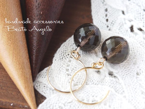 > ■+angelo+【高品質】K14GF 天然石スモーキークォーツのラウンドフックピアス(p-326) 10mm 高品質 一粒 ブラウン