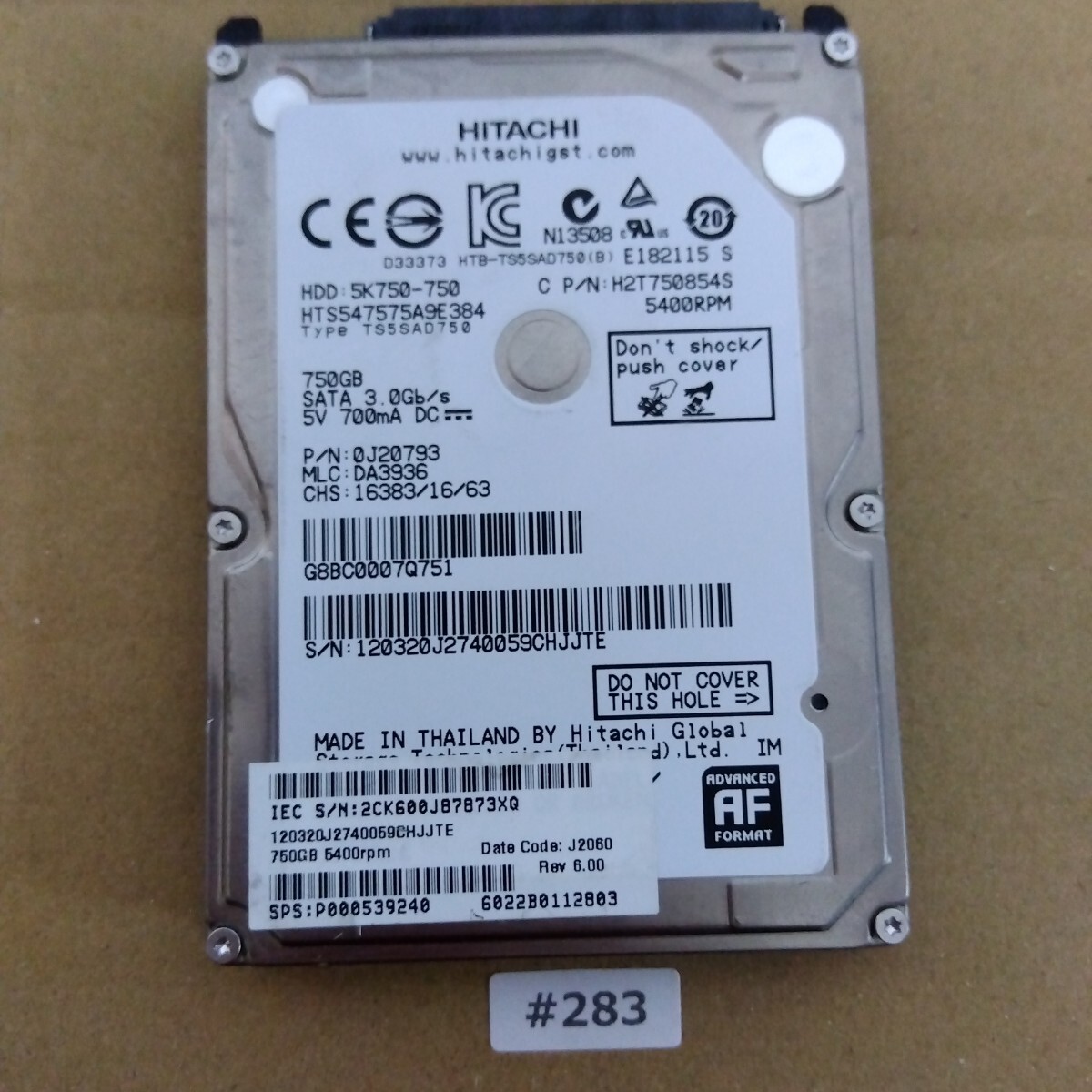 > HDD 750GB 2.5インチハードディスク / Crystal DiskInfo 正常 / #283 / Hitachi HTS547575A9E384