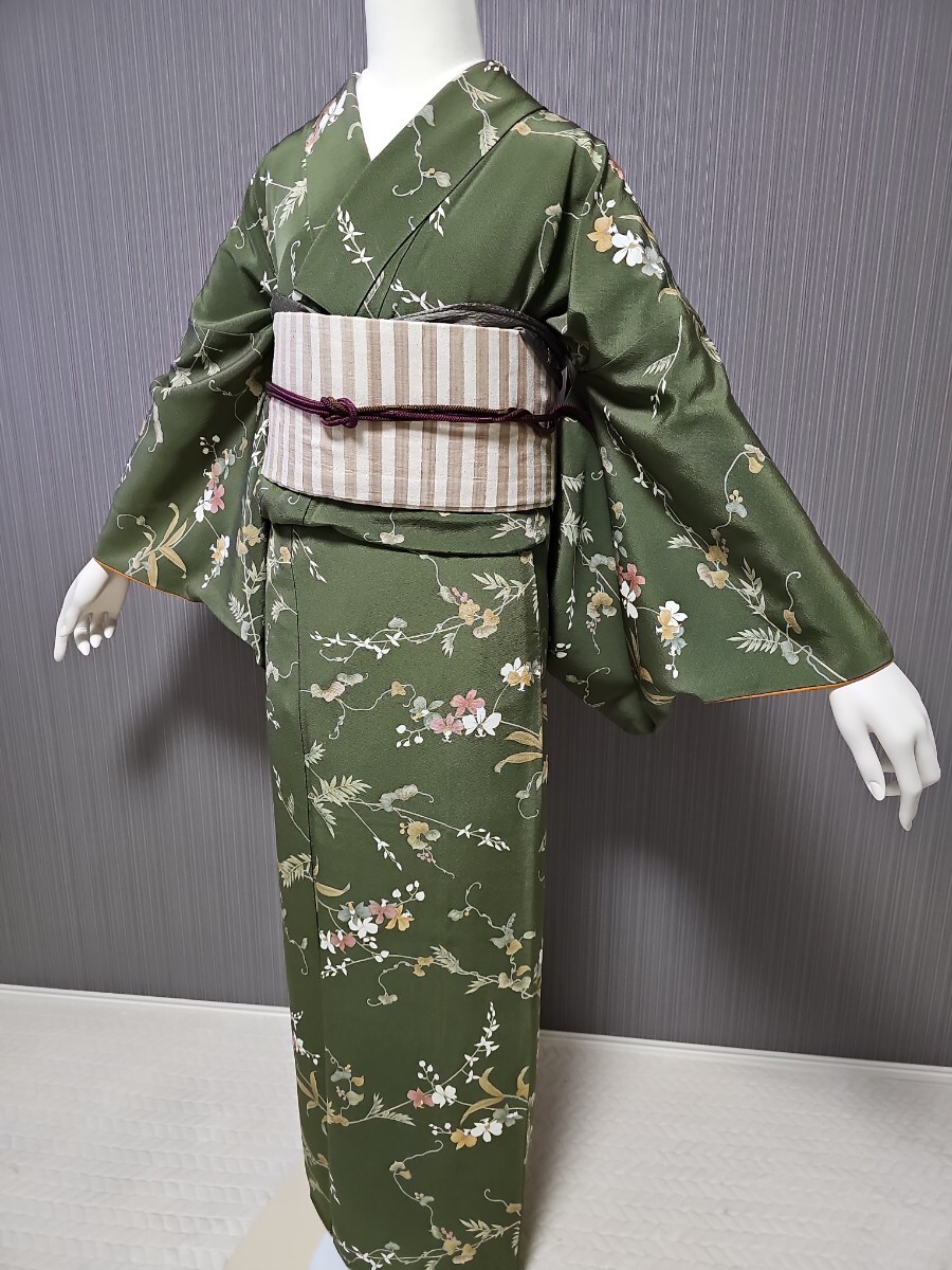 - すずや■307正絹金彩小紋 裄丈68cm 着丈162cm 麹塵寄りの深緑系