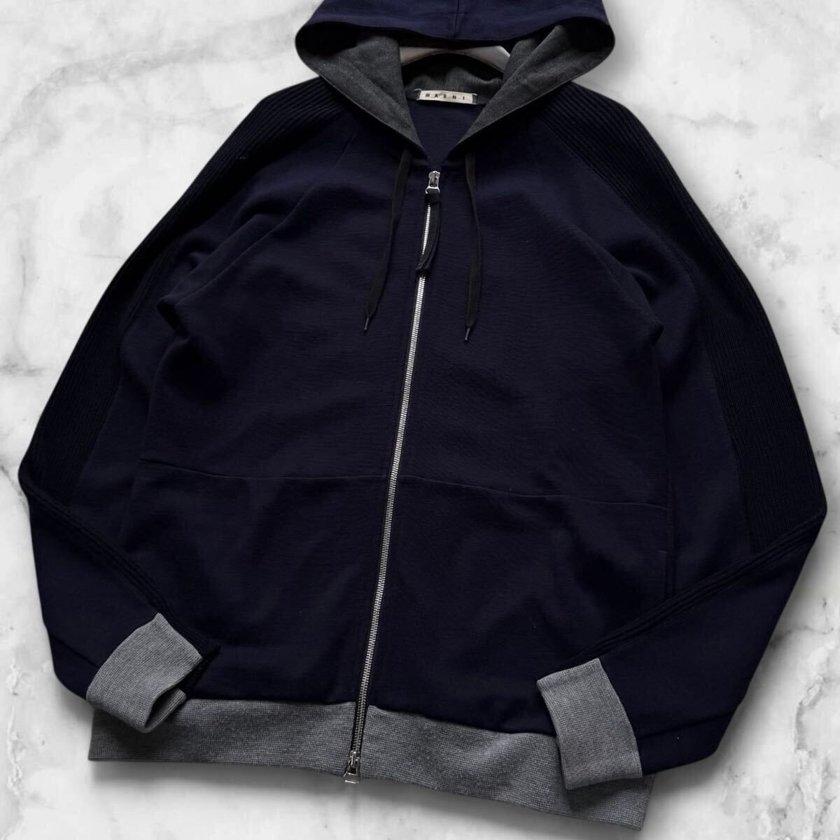 - 美品/XL相当●MARNI マルニ Wジップ パーカー ニット 切替 フーデットジャケット ブルゾン 羽織り ウール ネイビー系 メンズ イタリア製 50