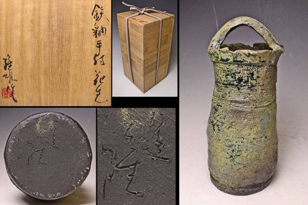- 岡崎隆雄 ★ 鉄釉手付花入 ★ 共箱 ★ 希少 ★ 深めの織部釉 ★ 検 加藤唐九郎
