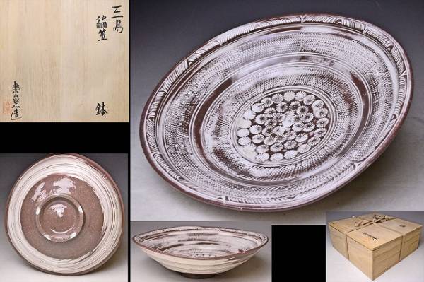 - 清水楽山窯 ★ 三島編笠鉢 ★ 共箱 ★ 美しい茶色と白 ! 検 清水日呂志