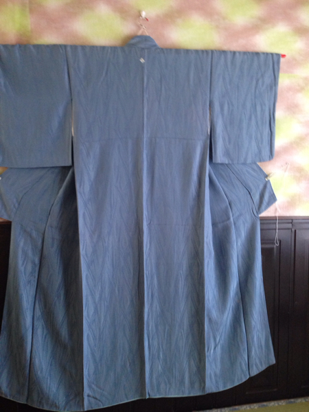 - 中古品 正絹袷着物(149) 露草色 地模様有 隅立四つ目紋 050305