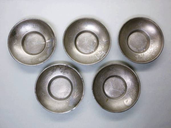 - [大幸] 乾茂号造 古錫`五清図詩文`円式茶托5客揃い 良品 錫製 時代道具 煎茶道具 古玩 煎茶具