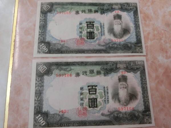 - ★ 朝鮮銀行券 朝甲100円券 極美品 連番 2枚セット ★ No.830