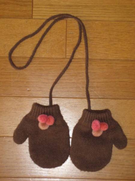 - 美品☆女の子用ボンボン付きミトン型手袋.茶色,肩紐有り