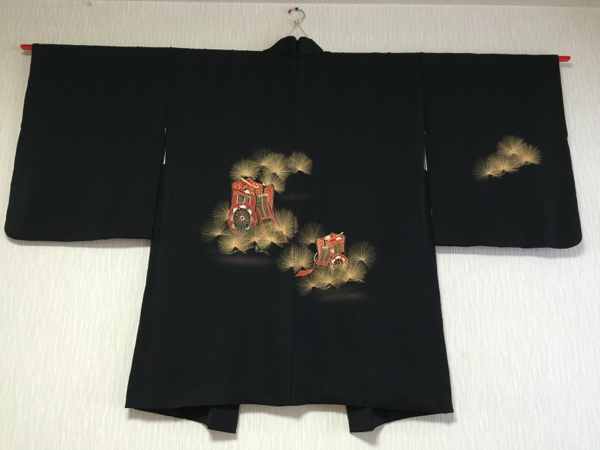 - 【絵羽織】正絹 袷 羽織丈78cm 金箔の松 花車 タペストリー小物