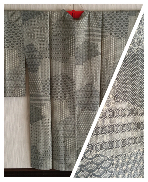 - 【道行コート】正絹 袷 コート丈85cm 躾けあり 七宝 亀甲 青海波 麻の葉 檜垣 毘沙門 などの柄 裏地は暈しで紗綾形文様です