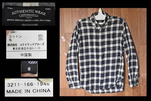 > ユナイテッド・アローズunited arrows★green label relaxing★薄手ネルシャツ風グリーン系チェックシャツ★autehntic wear★sサイズ