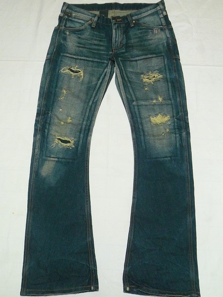 > 美品AKMxWRANGLERラングラー別注[PatchworkBandyLeggedDenimPants]MバナナブーツカットUsed加工