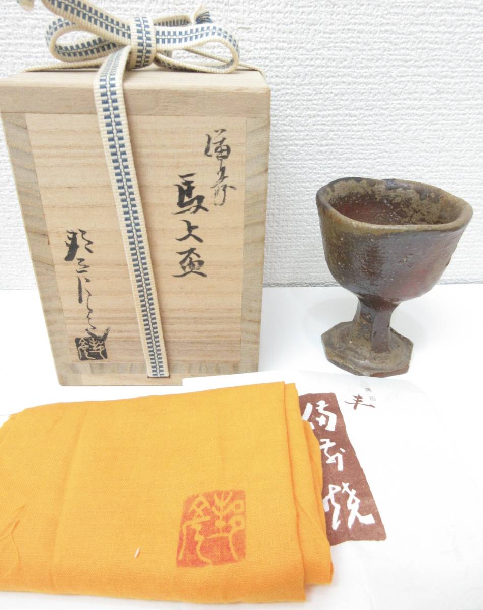 - 未使用品■備前焼 高原邦彦作 馬上盃 酒器 銘あり 木箱 管理1708 F-6