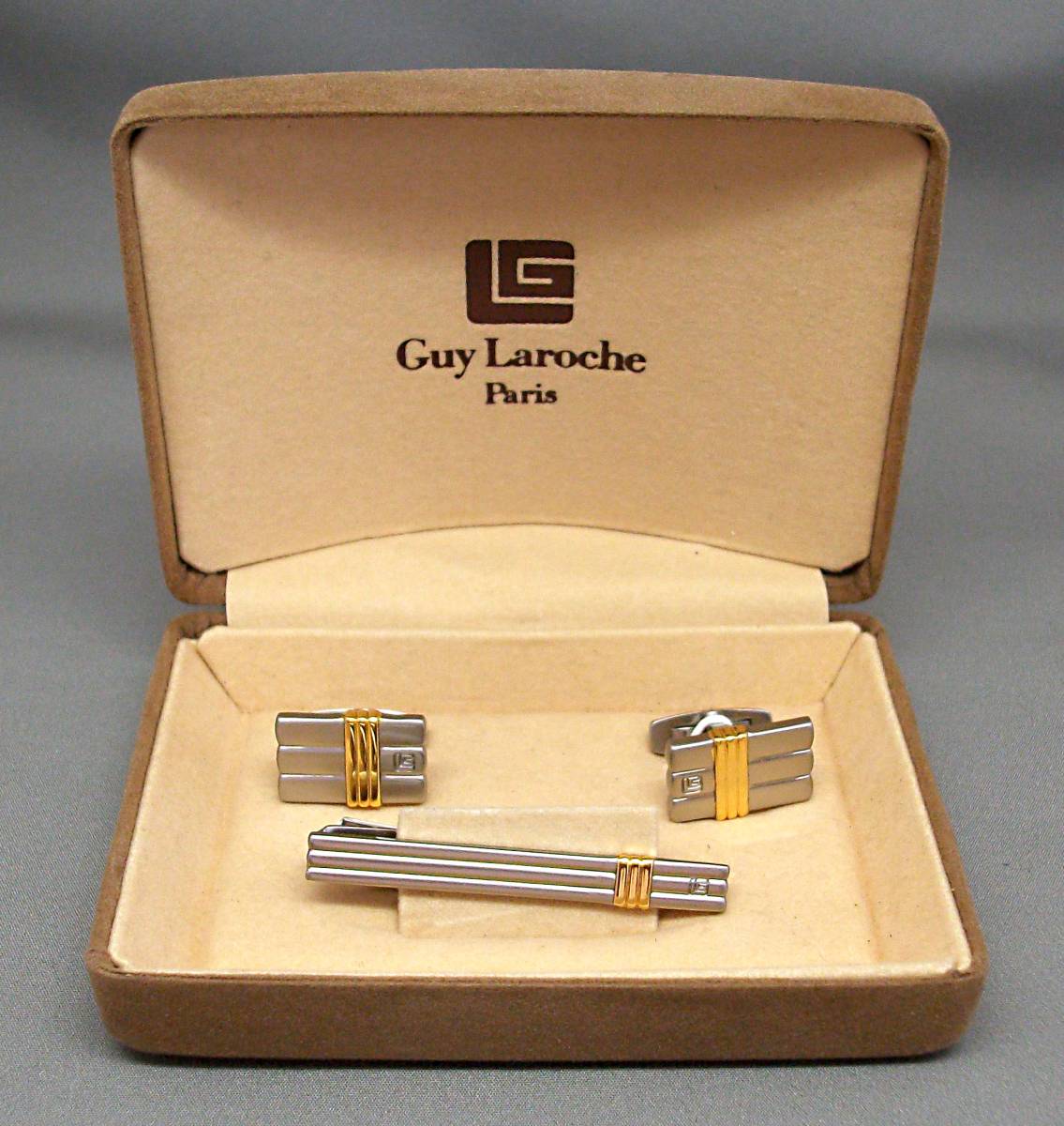 - EU-8930■Gui Laroche ギラロッシュ カフス & タイバー ゴールド&シルバーカラー ケース付き 中古■切手可