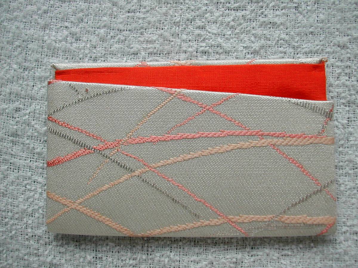 - 手作り 正絹帯地カードケース 定期入れ 保険証入れ (白地に橙・グレー・ピンクの線)