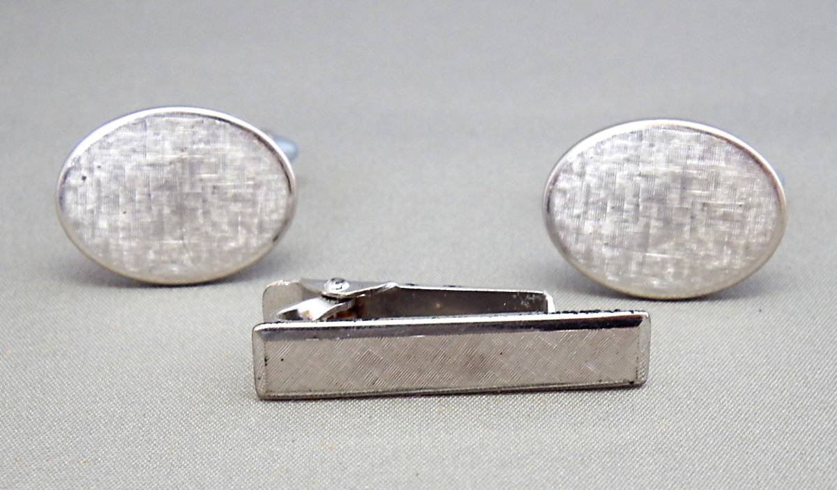 - EU-9244■KREMENTZ クレメンツ カフス&タイバーセット アメリカ カフリンクス シルバーカラー 中古
