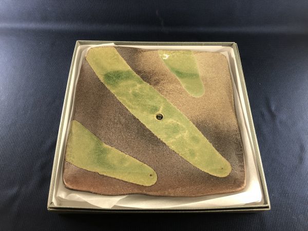 - 未使用品・逸品!★ 信楽焼 灰釉流四方皿 四角皿 大皿 箱あり管理1805 K-1