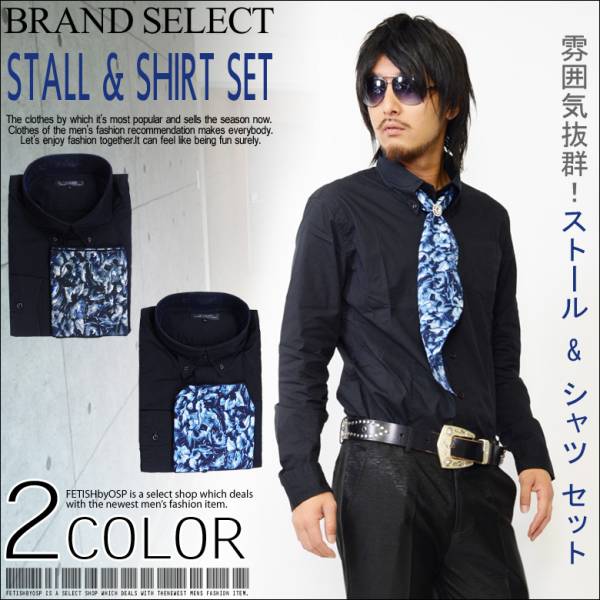 - RMANICA総柄ストール付きドレスシャツ新品ブルーx黒M