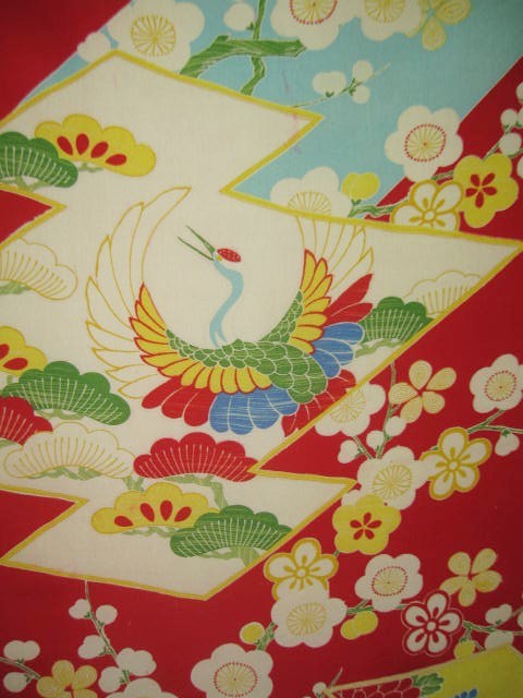 - 古布=171★赤地*鶴*菊*松竹梅*正絹*古布はぎれ★アンティーク