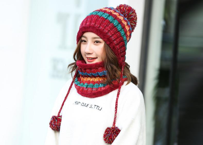 - 【新品】 ワインレッド ポンポン付き ニット 帽 レディース 帽子 スヌード 裏ボア セットアップ キャップ 裏起毛 酒紅色 スキー スノボ 赤