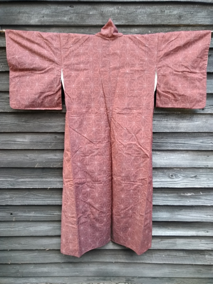 - 茜麻の葉文様紬アンティーク着物 正絹木綿混織