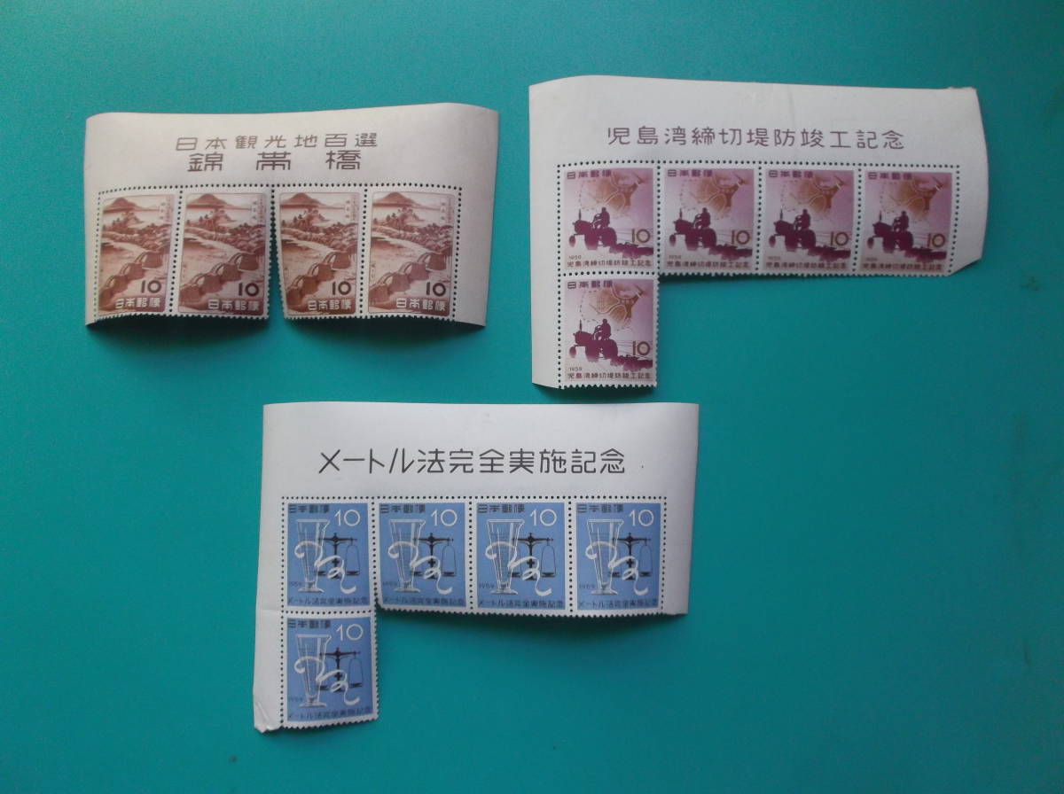- 題名入り記念切手 3種組 観光地 錦帯橋 広重の版画4B 1953.5.3 児島湾締切堤防竣工5B 1959.2.1 メートル法完全実施5B 1959.6.5