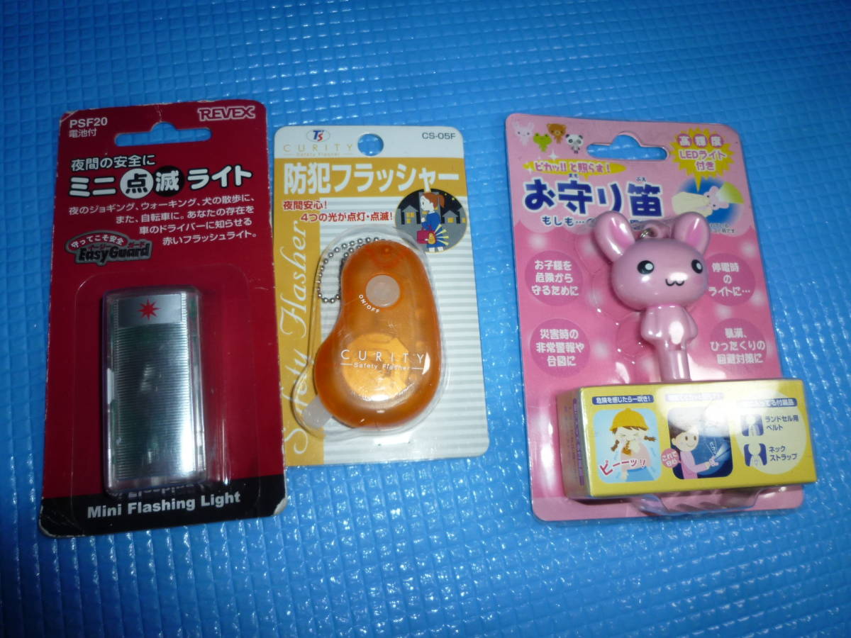 - b★未使用★LEDライト付お守り笛うさぎとミニ点滅ライトと防犯フラッシャーのお守り3点セット