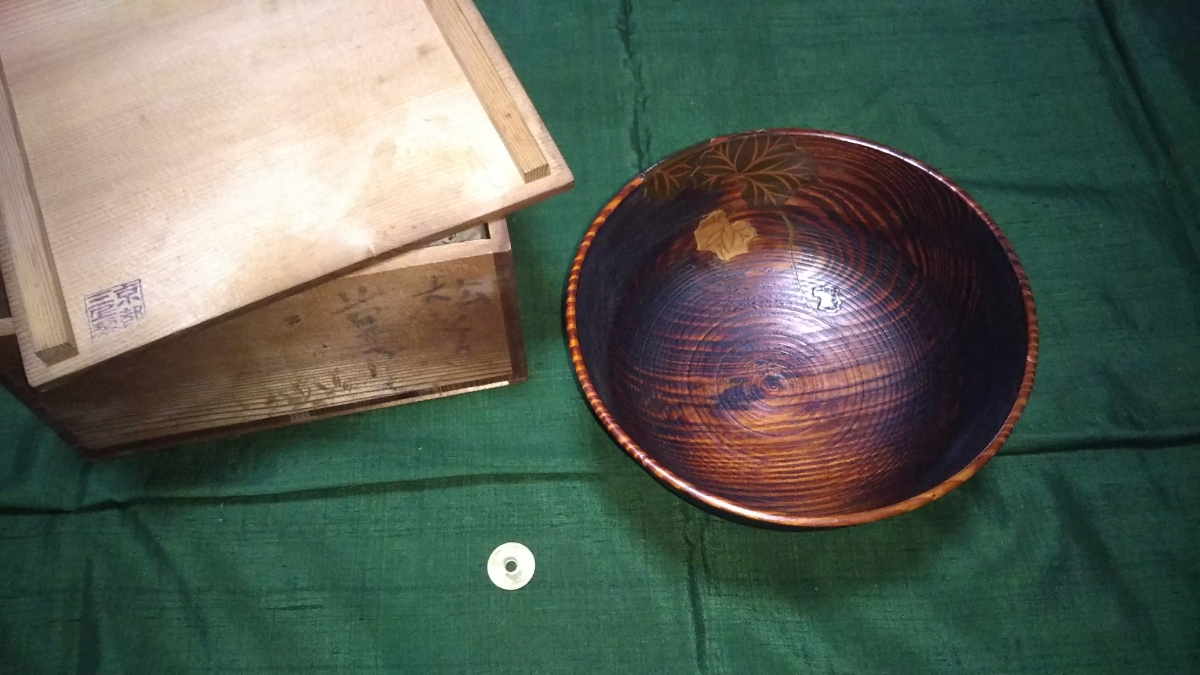 - 松材くりぬき葡萄図案菓子鉢(直径19.5㌢高さ9㌢重さ150㌘) 京都三正製 元箱有 美品漆器 菓子鉢