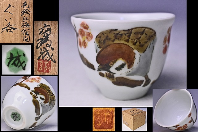 - 高橋誠 ★ 色絵紅梅雀図ぐい呑 ★ 共箱共布 ★ 師:人間国宝 藤本能道 ★ 酒器 ★ 愛らしくも迫力のある逸品 ★