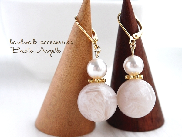 - +angelo+マーブルピンクビーズとスワロフスキー パールのピアス(p-002)G フレンチフック