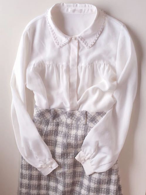 - 新品上下セット白ブラウス ×ツイードチェックスカート パターン グレー×ホワイト