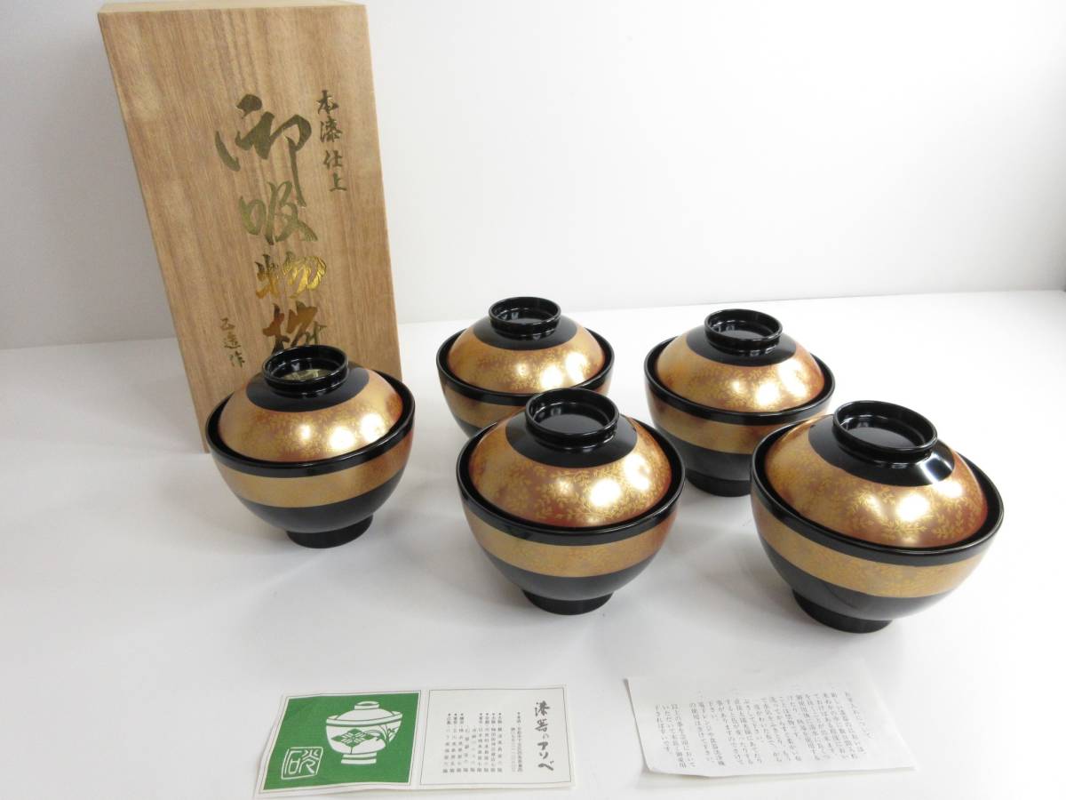 - 未使用品◆漆器のアソベ 乙造作 本漆仕上 汁椀 お吸物碗 5客セット 金 漆 同柄セット 管理2003 B-15