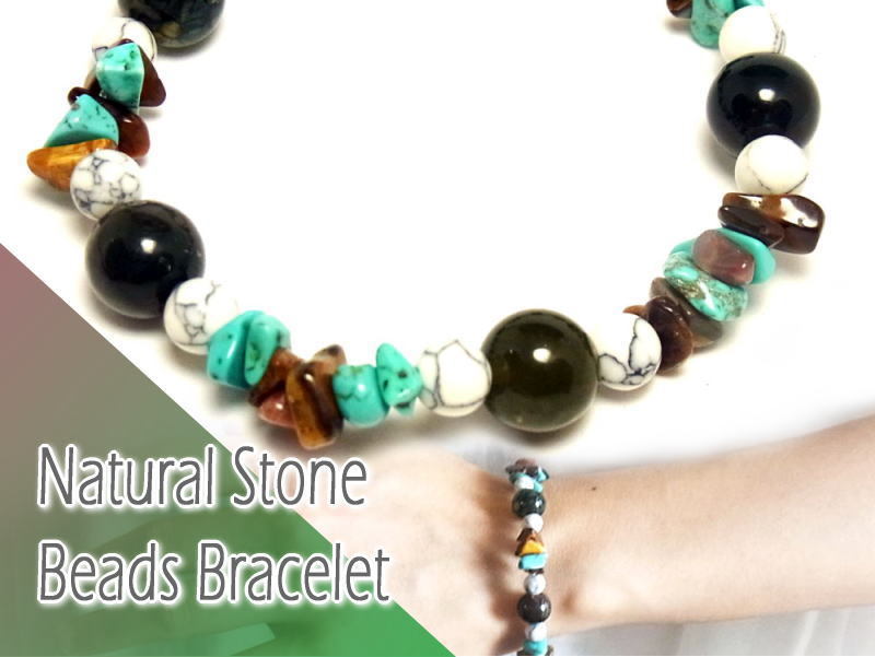 > アクセントのタイガーアイがおしゃれ♪ 手作り ブラックメノウ ターコイズ&ハウライト サザレミックス 天然石ブレスレット 18㎝