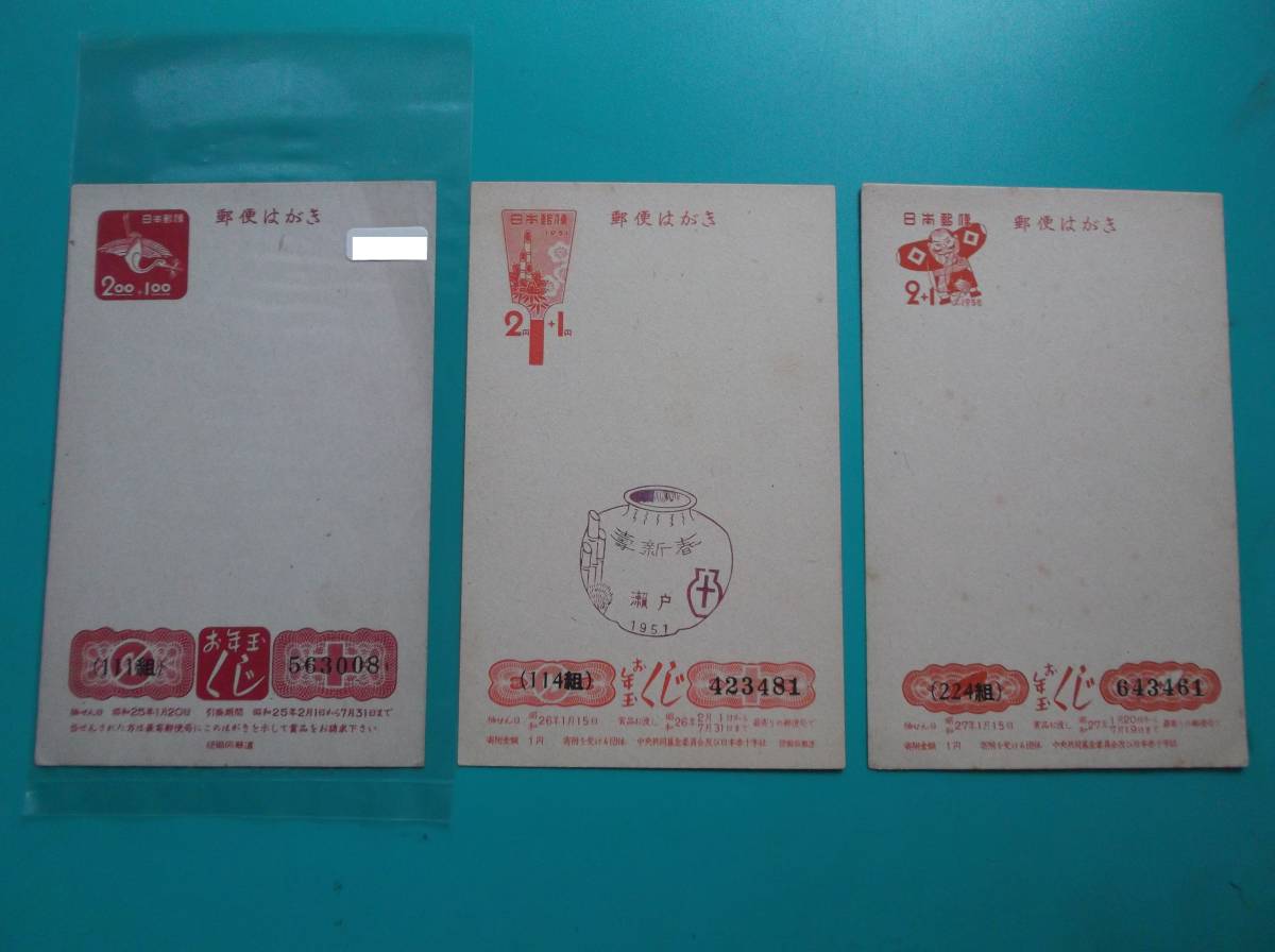- 官製年賀はがき 3枚組 松食いづる 紅 1949.12.1 羽子板に松竹梅 1950.11.15 記念印押印 やっこだこ 1951.11.15