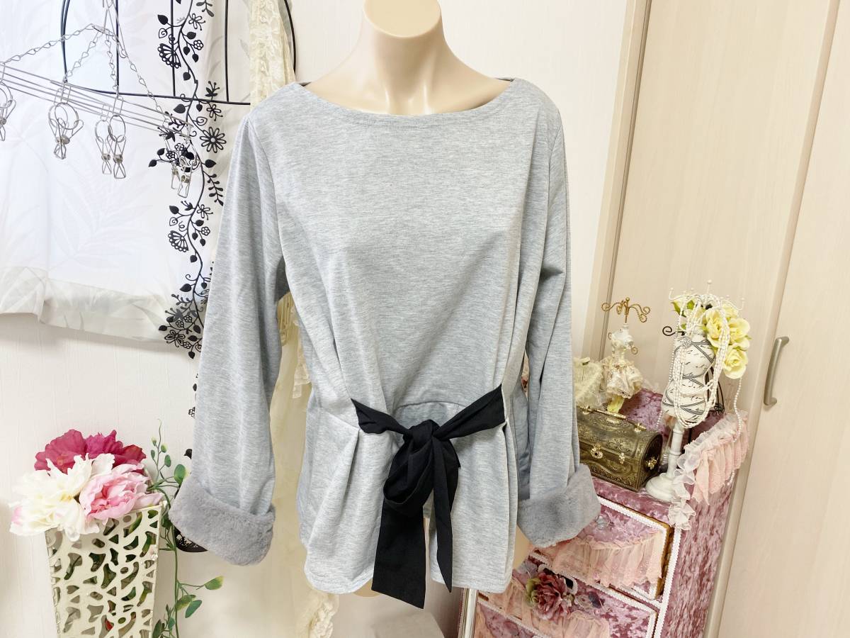 - レディス4Lサイズ:pasaran cantik◆裏起毛*リボン絞りぺプラム*袖先ふわふわ*トレーナーチュニック