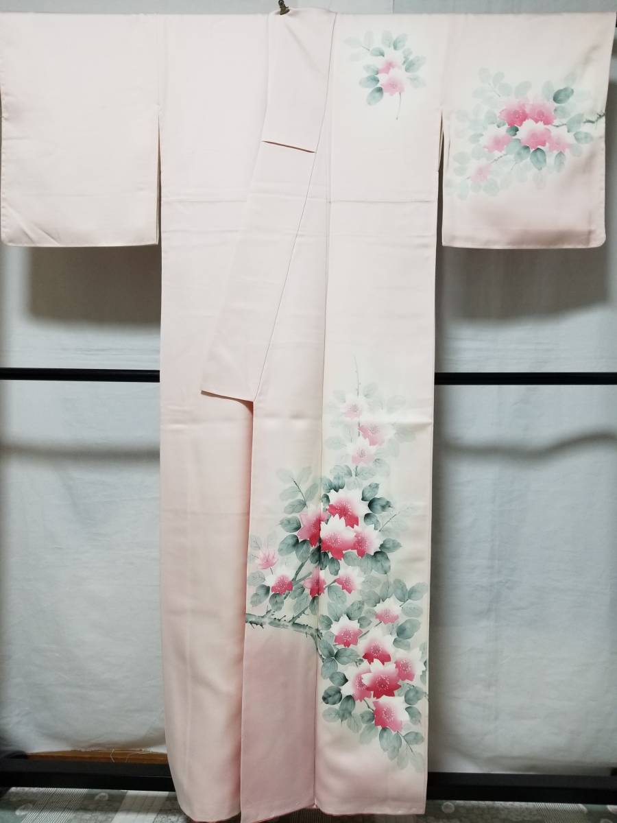 - 「桐輪】付下げ☆送料無料☆未使用品*美品*仕付け糸付{正絹*袷仕立*付下げ}*身丈159-裄64.5*桜色地*手描き染-花満開の可愛い花*№3432880