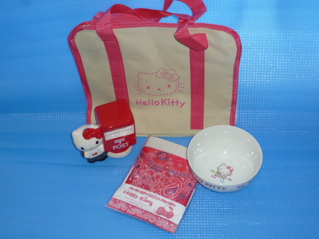 - a★未使用★ハローキティ リボンデザインどんぶりと郵便局JPポスト 貯金箱他4点