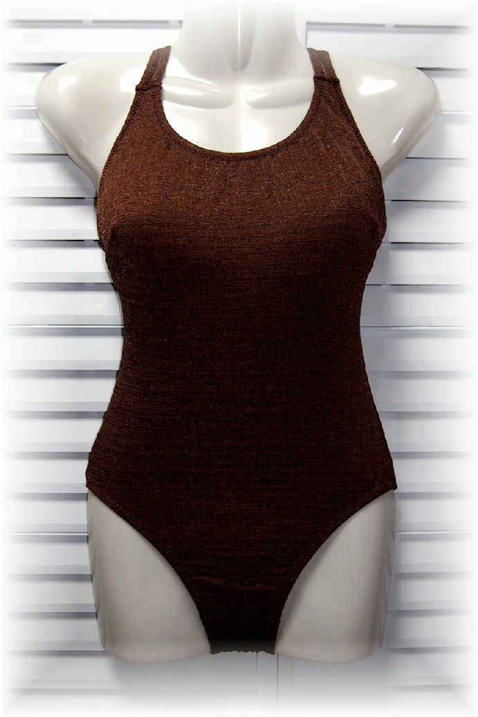 - 愛装 日本製 ワンピース水着 9号/M 光沢格子生地 ブラウン