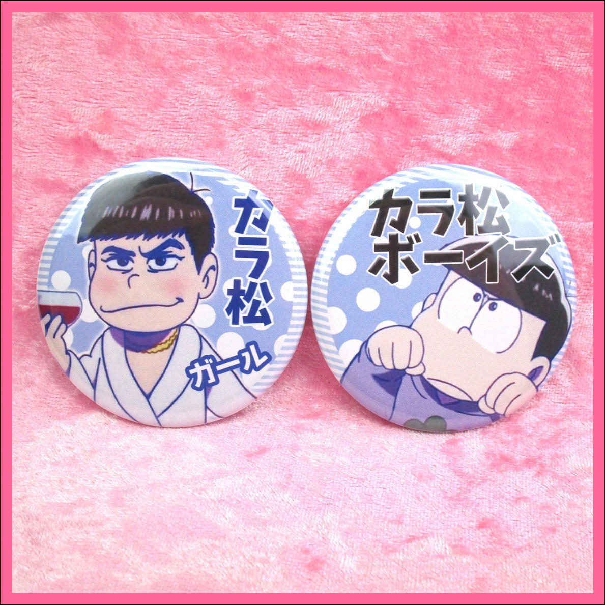 > おそ松さん プライズ 缶バッチ ★ カラ松 ボーイ ガール(ワイン)/ 2点 美品