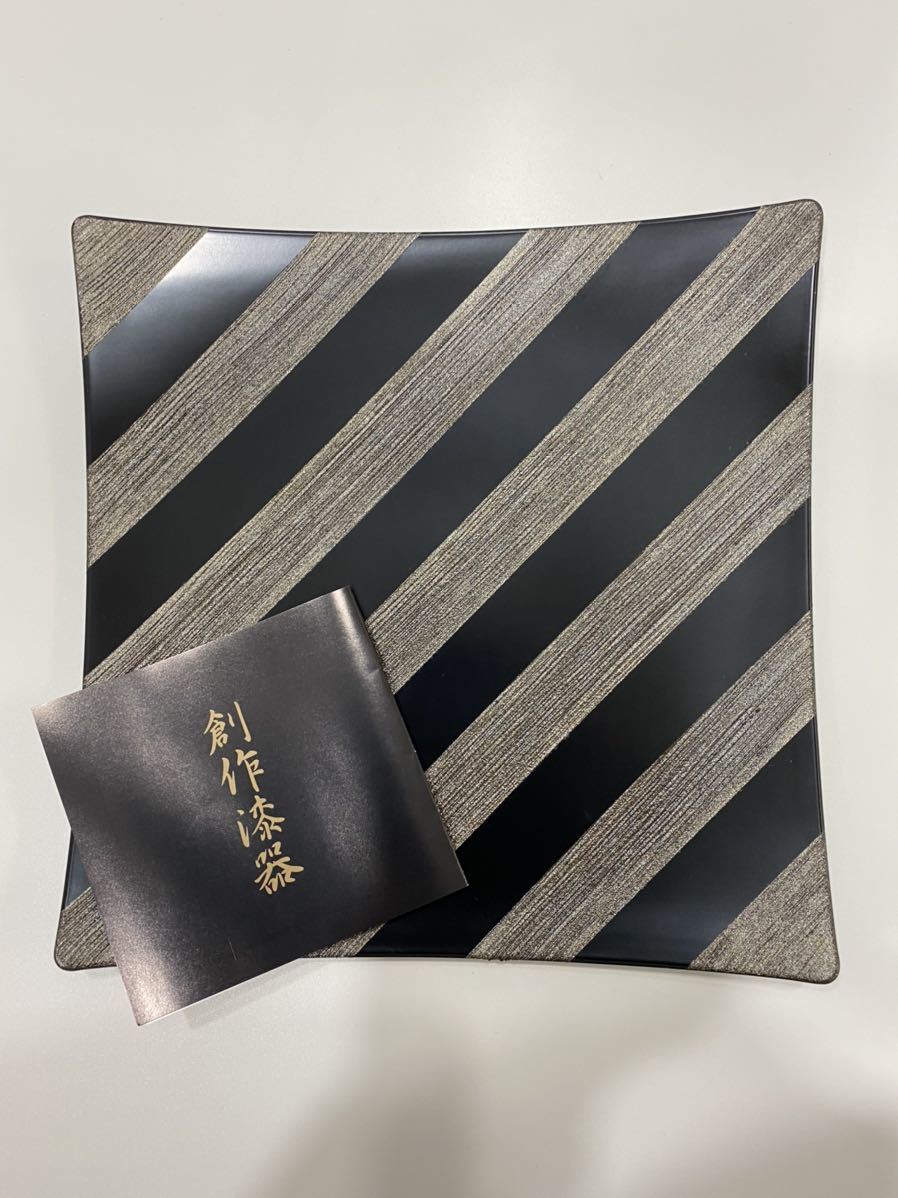 - 漆器 創作漆器 四方盛器 黒塗銀 お皿 ストライプ