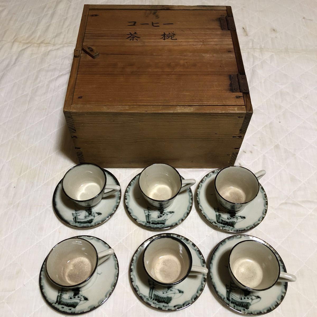 - アンティーク.カップ&ソーサー .コーヒー茶碗.図柄.波に南蛮船.作家物.昭和十三年3月.造.西本益喜.木の箱付き.浮き出た様な観入が有ります